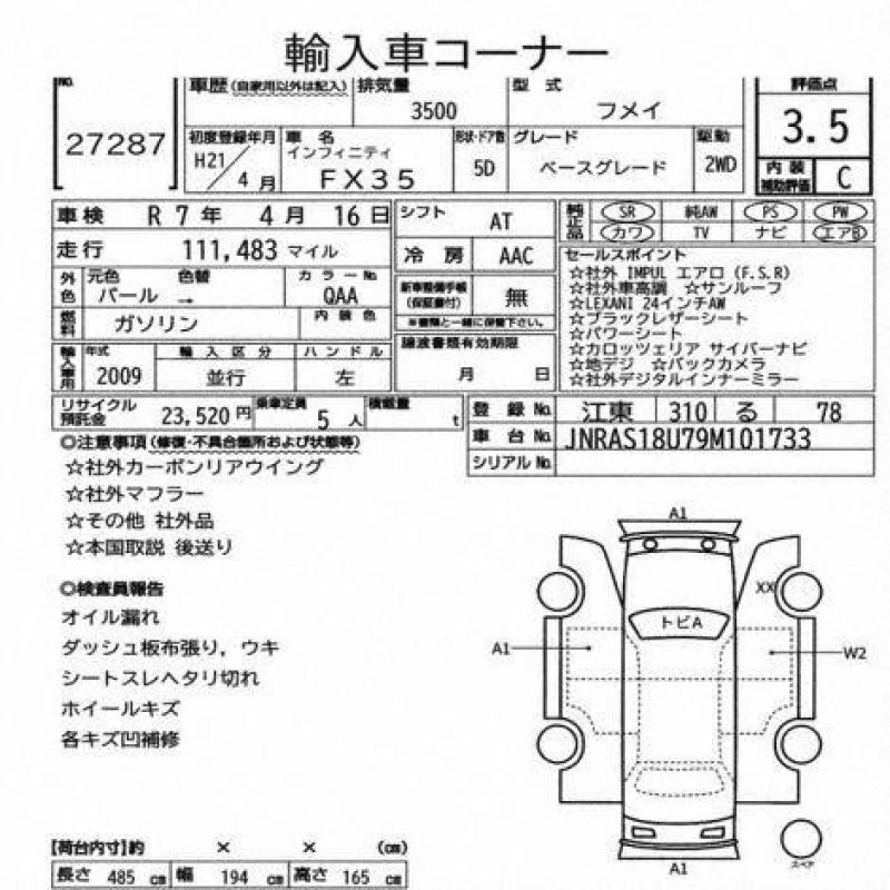 | Special Notes: 3500cc, PS, PW, Airbag,Leather Seat,Power seat,Sunroof,NAVI,TV,Back monitor |